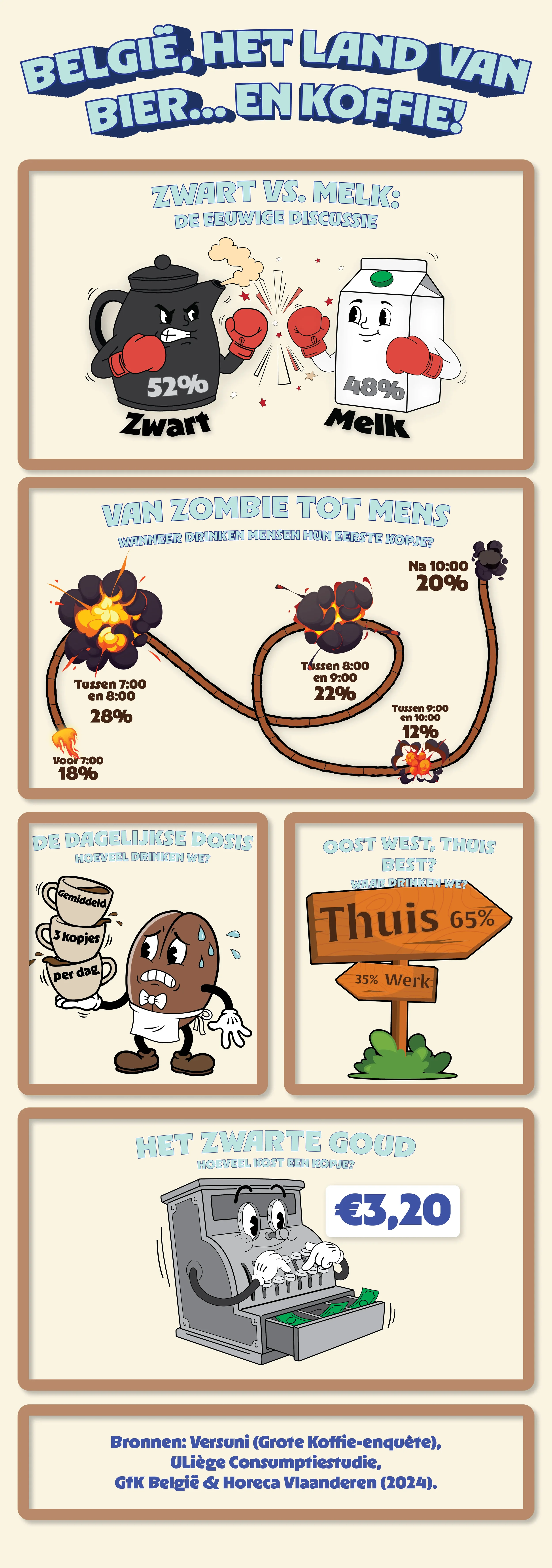 Ik heb gekozen voor een sterke, consistente art-direction geïnspireerd op vintage cartoons. Door gebruik te maken van Adobe Illustrator technieken zoals custom brushes, maskers en Live Paint, heb ik een dynamische lay-out gecreëerd die informatief én entertainend is. De illustraties versterken de data zonder afbreuk te doen aan de leesbaarheid.